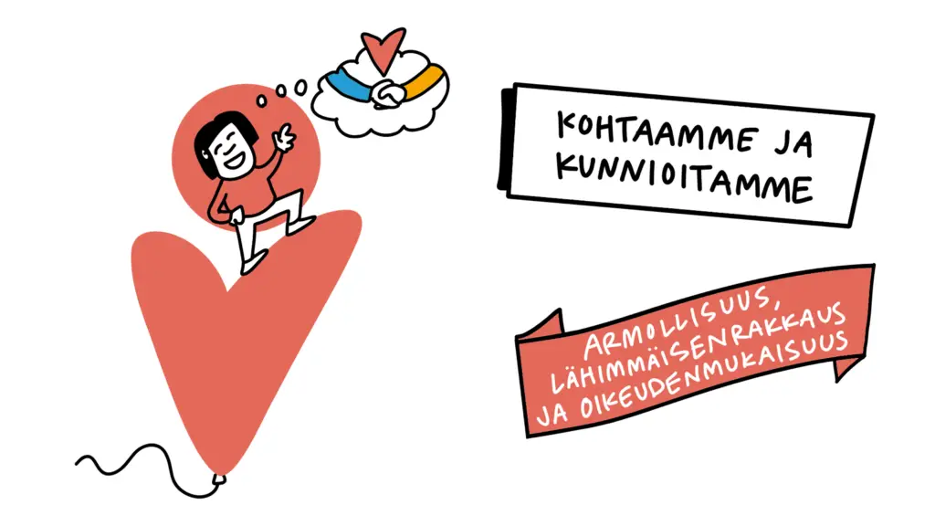 Pyrimme aitoihin, välittäviin ja läsnäoleviin kohtaamisiin. Rakennamme yhdessä kunnioituksen kulttuuria lähimmäisenrakkauden, armollisuuden ja oikeuden-mukaisuuden avulla. Harjoittelemme toistemme ymmärtämistä ja huomioimista sekä anteeksipyytämistä ja -antamista.